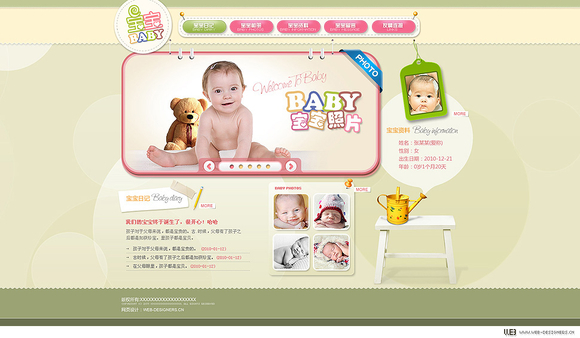 上海網(wǎng)絡(luò)公司分析,高亮度,低飽和度的黃色和綠色色彩營造出柔和溫馨的氣氛,重要信息部分用飽和度較高一些的綠色和紅色跳出。而背景中隨機大小的圓形疊加增加夢幻、可愛的氛圍。其余的設(shè)計元素,例如云朵般的曲線邊緣、logo和導(dǎo)航的針腳線、導(dǎo)航條背景的大頭針、寶寶日記的貼紙、寶寶照片吊牌、以及文字標(biāo)題的手寫字體都圍繞著整個設(shè)計風(fēng)格來運用,營造出整體溫馨的氣氛。